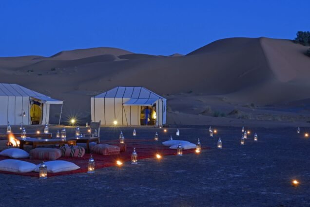 After enjoying some mint tea upon arrival, you may unwind in your luxurious tents with private showers and bathrooms while the Sahara displays its breathtaking dusk colors. Dinner is served, and while you dine, the group by the fire performs some music, adding to the romantic atmosphere of a starry Sahara night.